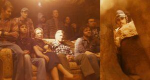 或许他想到了什么。这时电影运用艺术手法,在他所困之处不远处安放了一个沙发,金色的阳光洒在上面,他的亲戚好友们都坐在沙发上凝视着面前这个狼狈的年轻人,脸上透出些许哀愁和沉重。